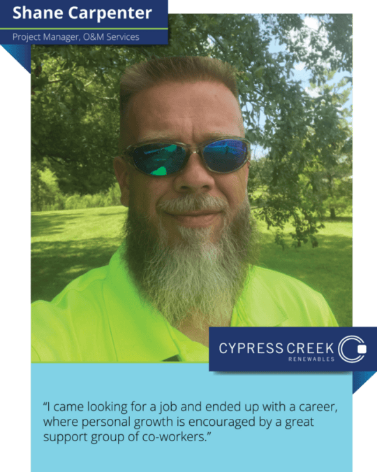 As we prepare to enter the next chapter with EQT’s backing, we celebrate our team. Cypress Creek people are driven by our mission of Powering a Sustainable Future One Project at Time. Today we start with Shane Carpenter. Based in western North Carolina, Shane is a project manager in our O&M Services division and has been a part of the FLS Energy and now Cypress Creek team since 2010. Shane is cross trained to work with the Unmanned Aircraft Systems team and passionate about sediment and erosion control on solar assets. Shane embodies our value for care, as he works with safety at the forefront and compassion for his team.