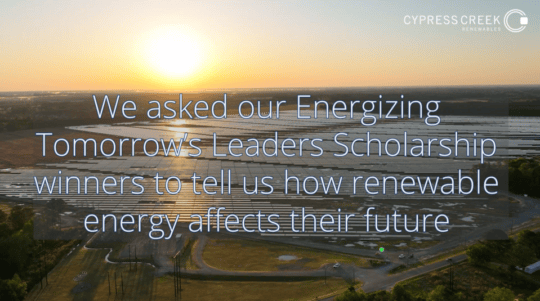 Cypress Creek Renewables is pleased to announce that 35 students from across the country were selected to receive its Energizing Tomorrow’s Leaders Scholarship award this year.